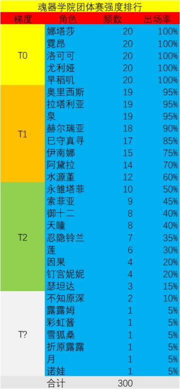 通过统计前十名所用角色得出的团体赛梯度排行