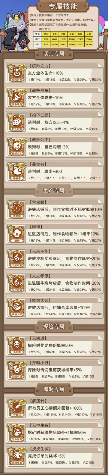 { "text": "新版本【员工技能汇总】及【员工属性公式】\n因大龙他们谈判力公式过于复杂,目前无人破解,只有其他属性计算方法。\n根据游戏更新内容,不定时更新。\n\n【战斗类员工推荐】:《雪人领主》(高星级,提升所有员工血量性价比比攻击高)>《皇家号手》(提升所有员工攻击)>《小护士》(生产系员工,因ss级上榜)>《熊管家》(需s级,属性上限比其他s高)>《暴食咸鱼》(提升自身攻击高)>《战地记者》(降低对方攻击,战斗员工只有记者可以重复拥有)\n\n【战斗类技能推荐】《攻击》>《暴击》>《命中》>《闪避》>《力量》>《智力》>《速度》,其他技能建议不要\n\n【店铺类员工推荐】:《喵管家》(材料是所有生产的基础,数量跟生产基地数量一致)>《熊怪》\n(虽然只有沙雕实验室能用,但是是所有餐馆员工中加成最高的)>《宇智波兔》(减材增产双加成很爽的,)>《熊大厨》(增产加倍比兔子高很多)(兔子和熊作用重复,除了实验室其他店面都有其中一个就好)\n\n【店铺类技能推荐】:《速度》>《智力》>《力量》,其他技能建议不要\n\n\n【探险类员工推荐】:《特工鸭》(神鸭,最不需要星级的员工,数量越多越好,上限25只左右即可)\n\n【探险类技能推荐】:《收益》>《锤子》,其他技能建议不要\n\n其他员工建议大家都养一只收藏,其他全部分解掉吧。", "raw_text": "" }