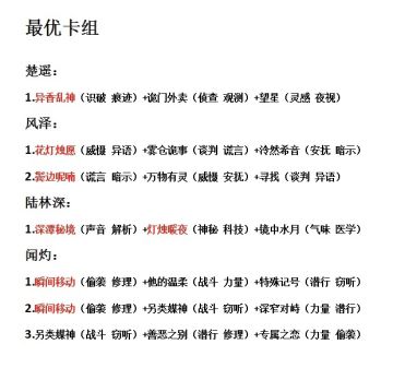 目前卡牌的最优卡组,红色字体为限定卡牌,黑色为常驻卡牌