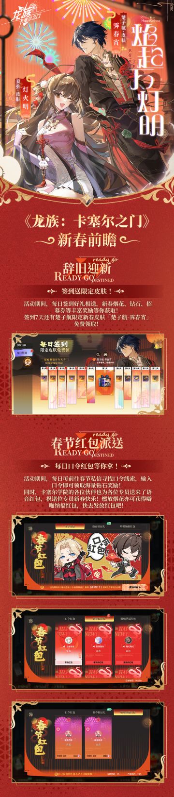 各位亲爱的专员: 新春将至,我们为各位专员带来了新春版本更新内容。 楚子航皮肤免费送、社媒抽奖连抽14天!祝各位专员新春快乐! #龙族卡塞尔之门