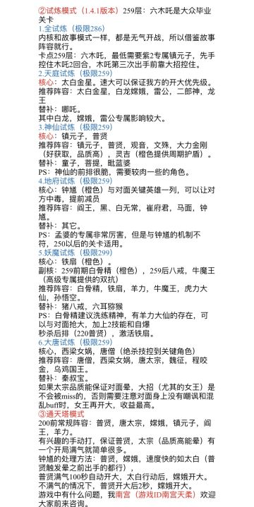 { "text": "《真大闹天宫》进阶摸鱼攻略\n 写在1.142(武则天,太上老君)版本,不得不说从镇元子之后出的英雄都挺强的,各有特色,在这里温馨提醒大家,小氪怡情,大氪伤身。此攻略适合度过新手期微氪双月卡玩了两个月以上sr普橙之后的日常每日。\n —斗法:两周一一次上午挑战npc刷胜场主线的机会,尽快毕业后开始摸鱼。\n—试炼:拿到250层奖励暂时毕业,具体攻略ios区南宫大佬有写,不再赘述。\n—挑战:有精力的可以挂一级卡不三星刷紫玄石,没精力直接拉到最后三星领取所有奖励。目前本人辅助和坦克打不过最后一个,直接打上一档摸鱼。\n—故事:新开61-62章节,从这里开始boss需要12个不同的英雄来通关。括号为法宝等级。\n一队:橙色嫦娥(紫三)橙二李世民(紫二)橙二观音(紫一)紫色镇元子(蓝二)橙色魏征(紫二)橙一普贤(紫二)\n二队:橙二孙悟空(紫二,体力洗练!)橙二杨戬(紫二)橙二龙三(紫三)紫二太白金星(蓝二)橙二阎罗王(紫一)橙二女儿国王(蓝色)\n全程自动通关,无需手动释放大招,过不去手动调整英雄站位!具体阵容放在最后的图片里,这里说下难点。61:最低等级要求220级,不然等级太低命中率太差,保证李世民放大招有大概率过关。一队难秒黄风怪多试几次,先苦后甜。\n62:最低等级要求221级最好222级以上,本人222级通关。难点同上。62-30需要把二队的阎罗王和女儿国王换一队的镇元子和普贤来克制牛头精(据某树说这是强仔成精变幻的,巨恶心。),62-30先甜后苦,2队品质差,需要较多次sl普贤无限晕才能秒掉黄风怪。\n—探险:每天三次白送碎片,注意观看战斗,随时准备救场,小心阴沟里翻船,本人有次差点翻车…\n—远征:第一轮攒好气,手动无压力,每日福利。\n—通天塔:每周前十摸鱼,不行就前二十…本人纯白嫖,切勿上头,真强好胜要不得…一般200层以上,能走多远算多远,就是跳关无气太坑了,严重影响摸鱼效率!万人血书强仔通天塔第一次上阵人物满气!!!\n阵容:杨戬、李世民、观音、普贤、龙三、阎罗王\n替补:牛头、嫦娥、女儿国王、东海龙王、镇元子、太白等\n说下基本套路,打钟馗先净化再爆发伤害一套带走(阎罗大招,杨戬大招等)。打牛头精用持续伤害去打不反击(普贤大招、龙三大招等)。打铁扇+钟馗+程咬金敏捷不够就调站位先自动净化再接爆发防钟馗恶咒。\n—仙境:仙境6个大剑冢,5次以内刷到ssr都不亏,每天30个ssr碎片美滋滋。\n目前仙境怪难度最高的就是普贤队,减蓝条加蓝的英雄分散开,确保都能打过普贤队即可。我的仙境6队会截图发给大家参考,镇元子和新出的六耳猕猴、武则天、太上老君等都可流动以备不测!\n—结语:感谢大家听我唠叨,开区就一直玩,到现在八十多天了,有走掉的,有新来的,有和我一样一直坚持的,确实有的地方不尽如人意,但偶尔也会有亮眼的地方,最后希望OOG能推陈出新,给玩家带来更好更有趣的游戏体验!", "raw_text": "" }