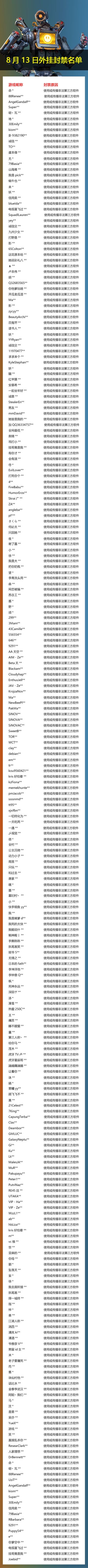 【安全公告】外挂封禁名单公示-8月13日