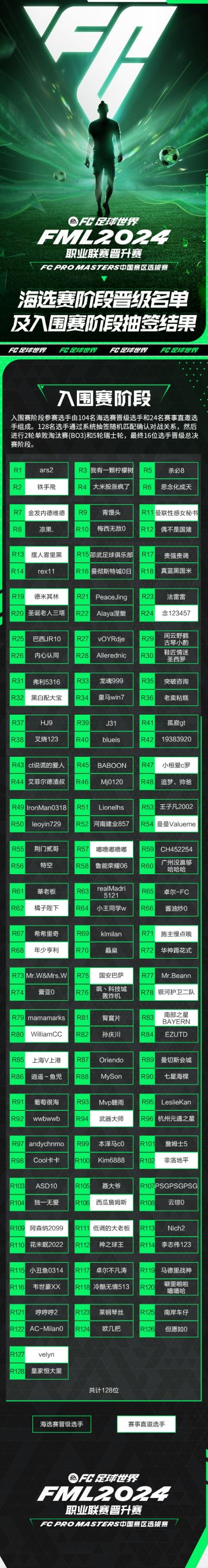 《FC足球世界》FML2024职业联赛晋升赛直邀选手名单!