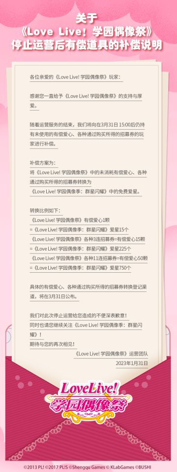 关于《Love Live! 学园偶像祭》停止运营后有偿道具的补偿说明