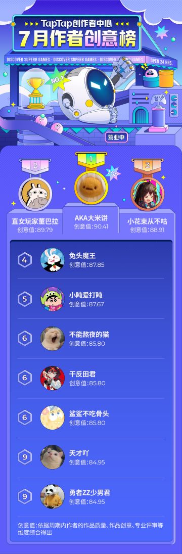 TapTap创作者中心7月榜单出炉